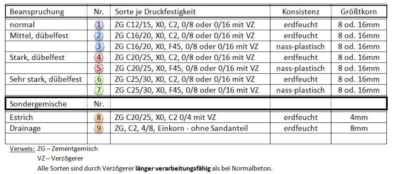 Gerne übernehmen wir auch ihre eigenen Mischungen nach ihrer eigenen Rezeptur! Diese können Sie im Bestellmenü unter ihren eigenen Namen finden. Bitte bedenken Sie, dass wir bei kundenspezifischen Mischungen keine Gewährleistung auf Betongüte bzw. erforderlichen Festigkeiten geben. Kundenspezifische Mischungen sind nicht mit dem Gütezertifikat gedeckt! Alle unsere Zementgemische dürfen nicht für den Konstruktionsbau verwendet werden (siehe Bez.: X0 !)